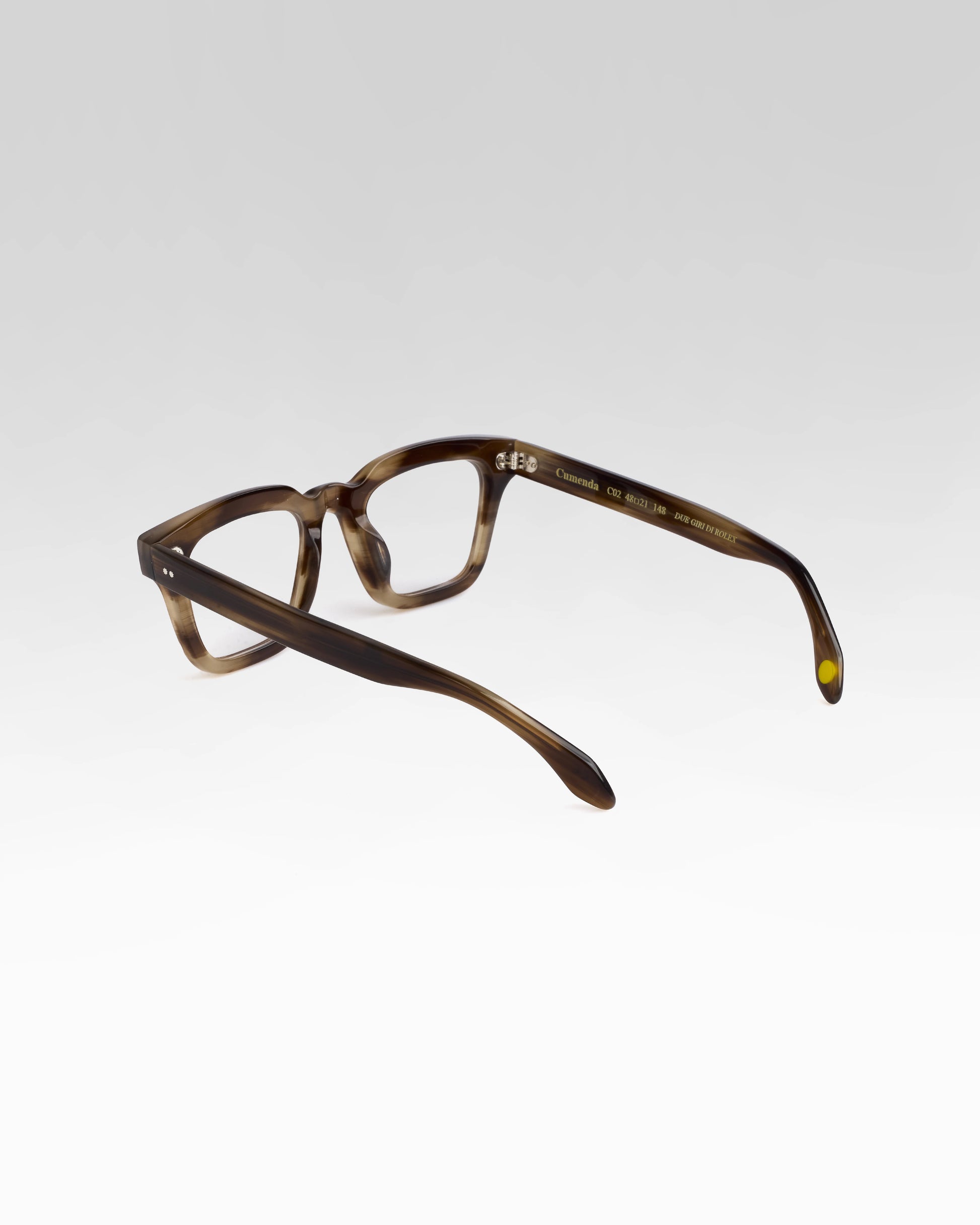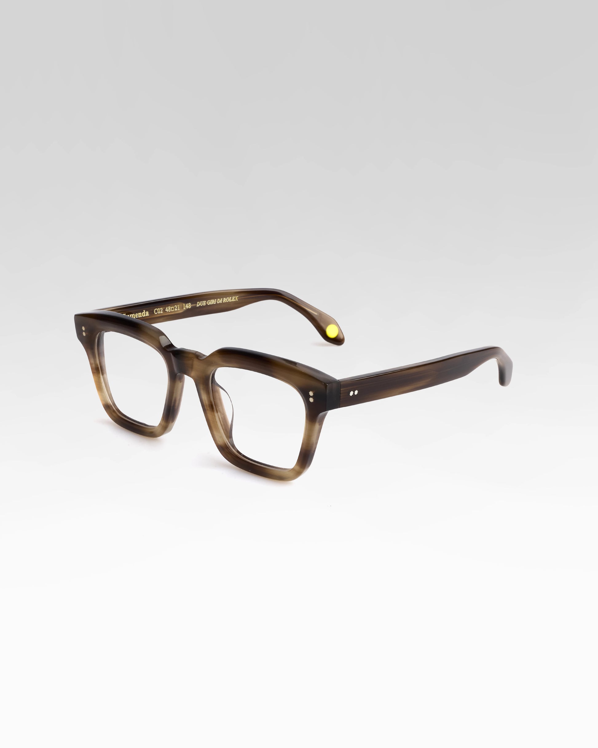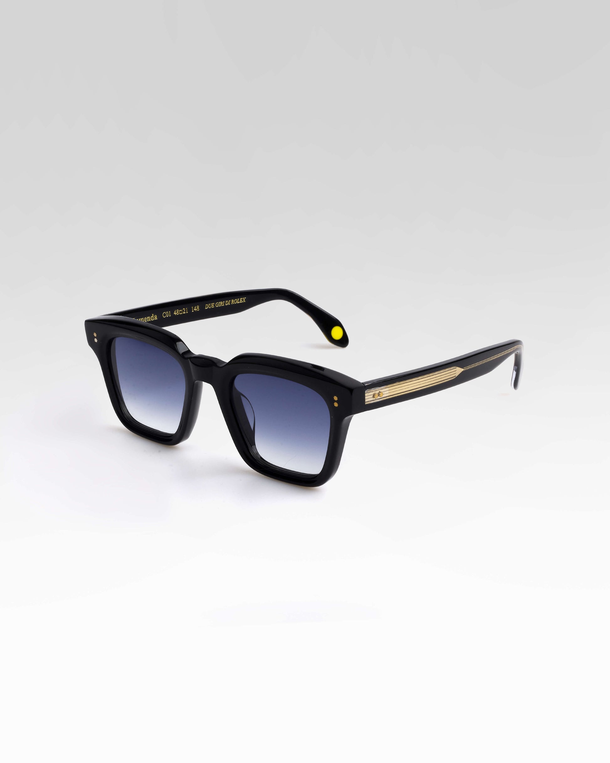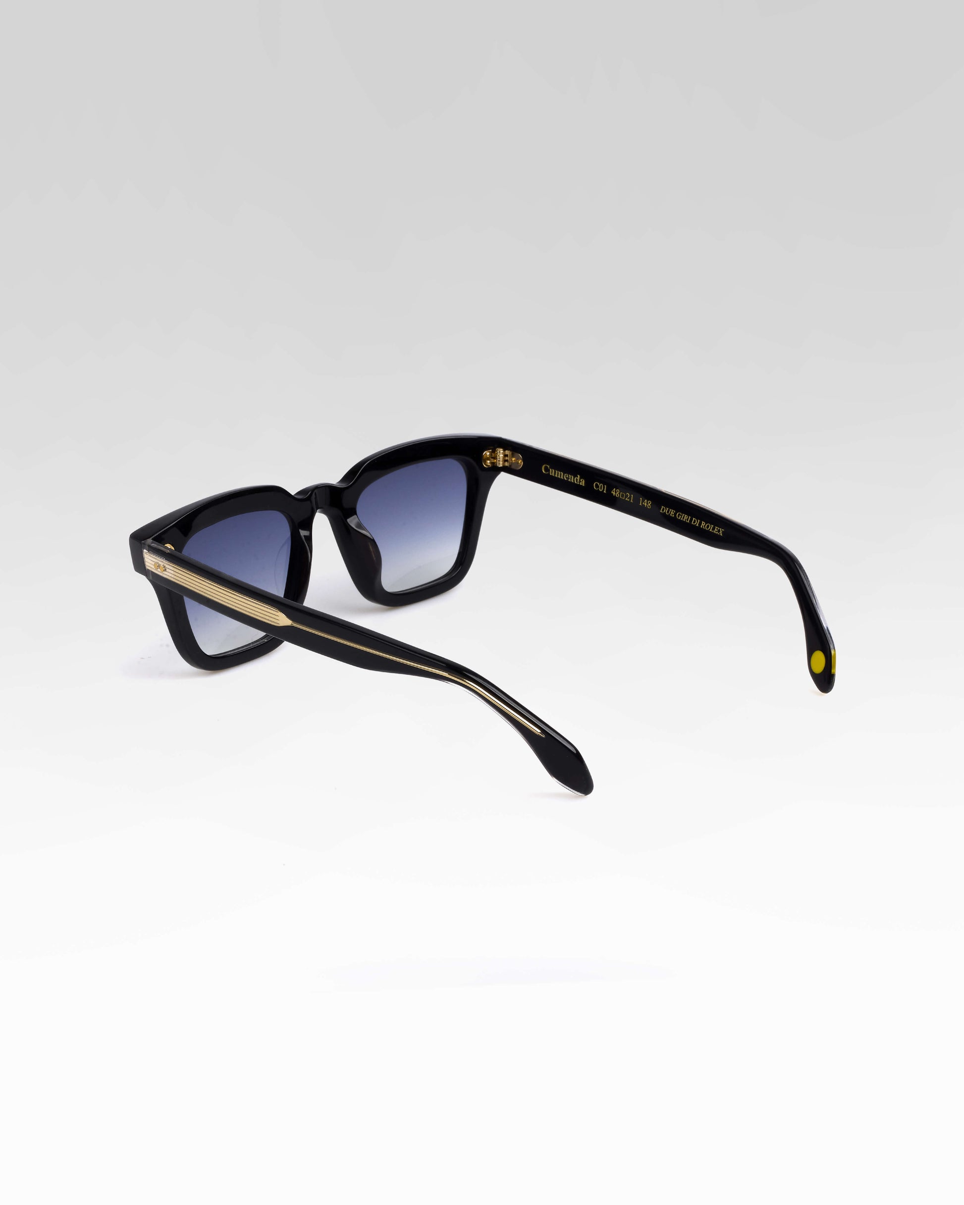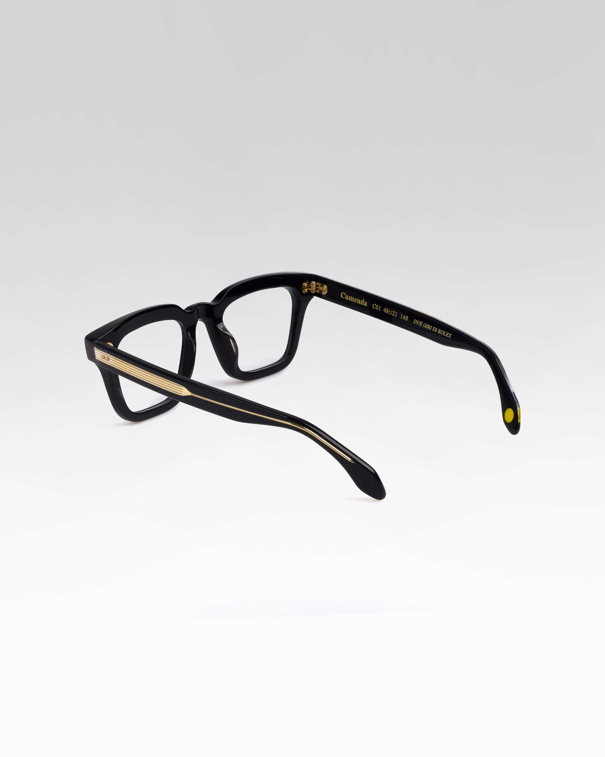 Realizzato interamente in Italia e lavorato per oltre 80 ore da artigiani del Cadore, è costruito in acetato di cellulosa pregiato, con forma squadrata decisa e montatura spessa. Le anime a vista dorate, di ispirazione retrò, impreziosiscono le aste e ne rafforzano l’identità.