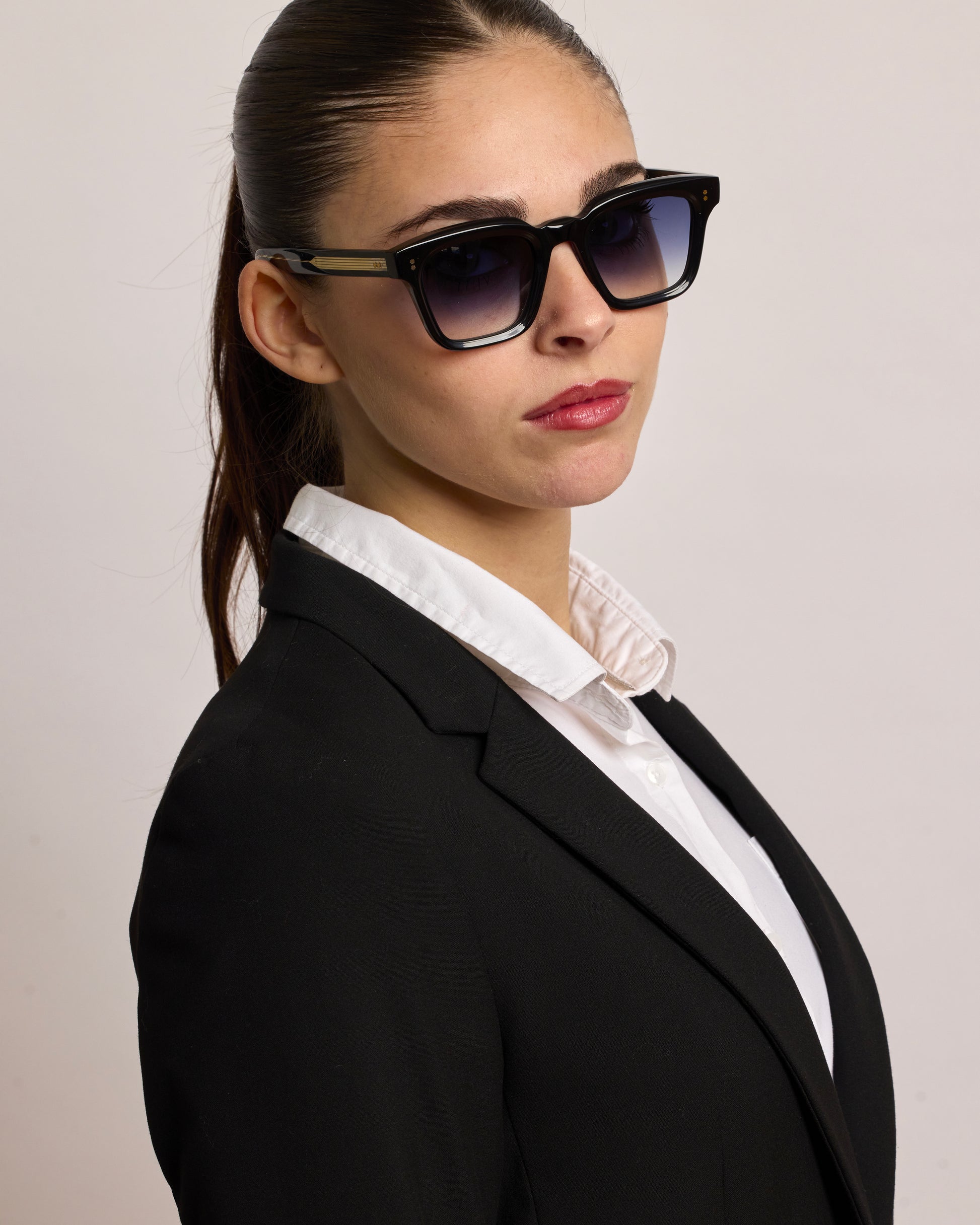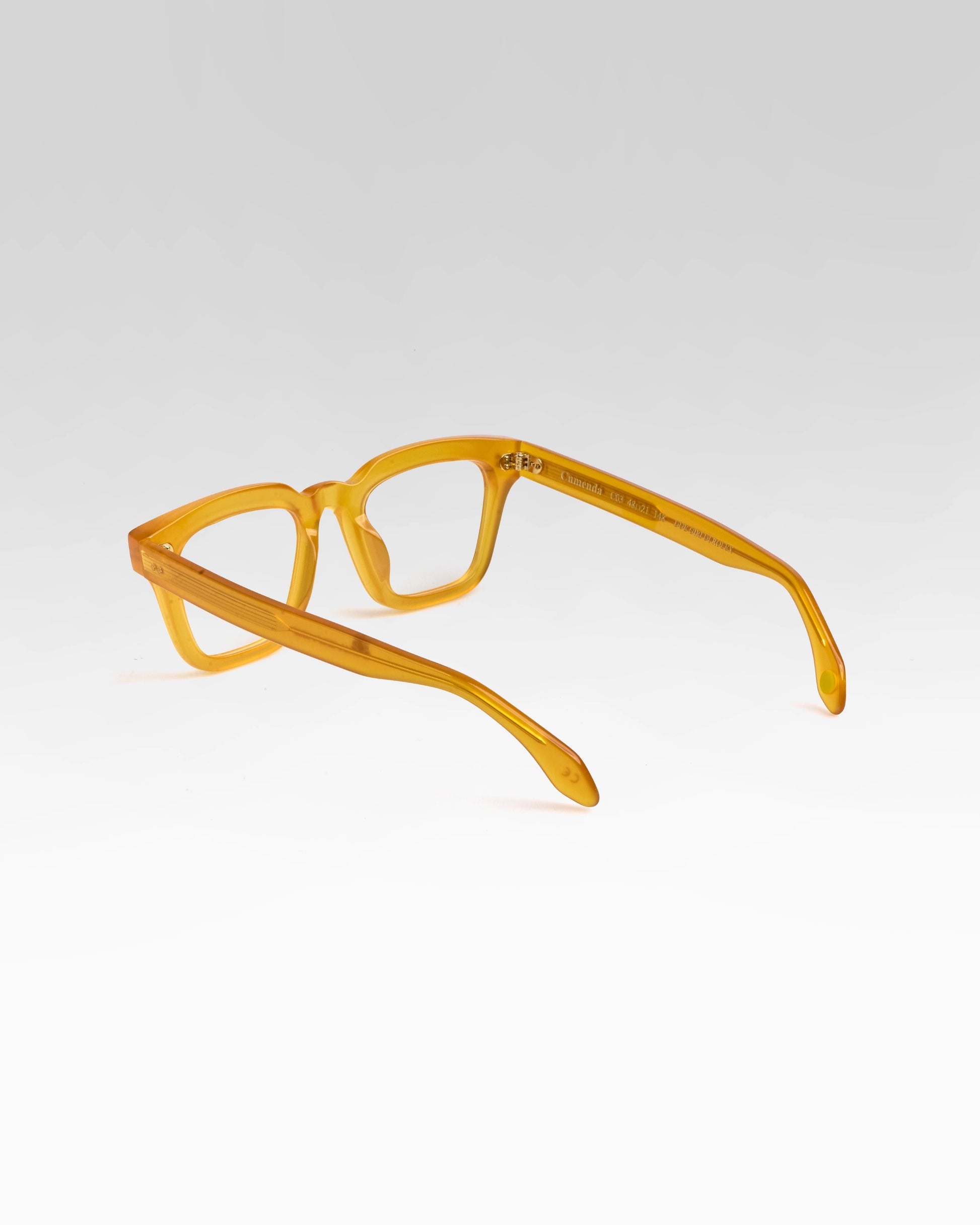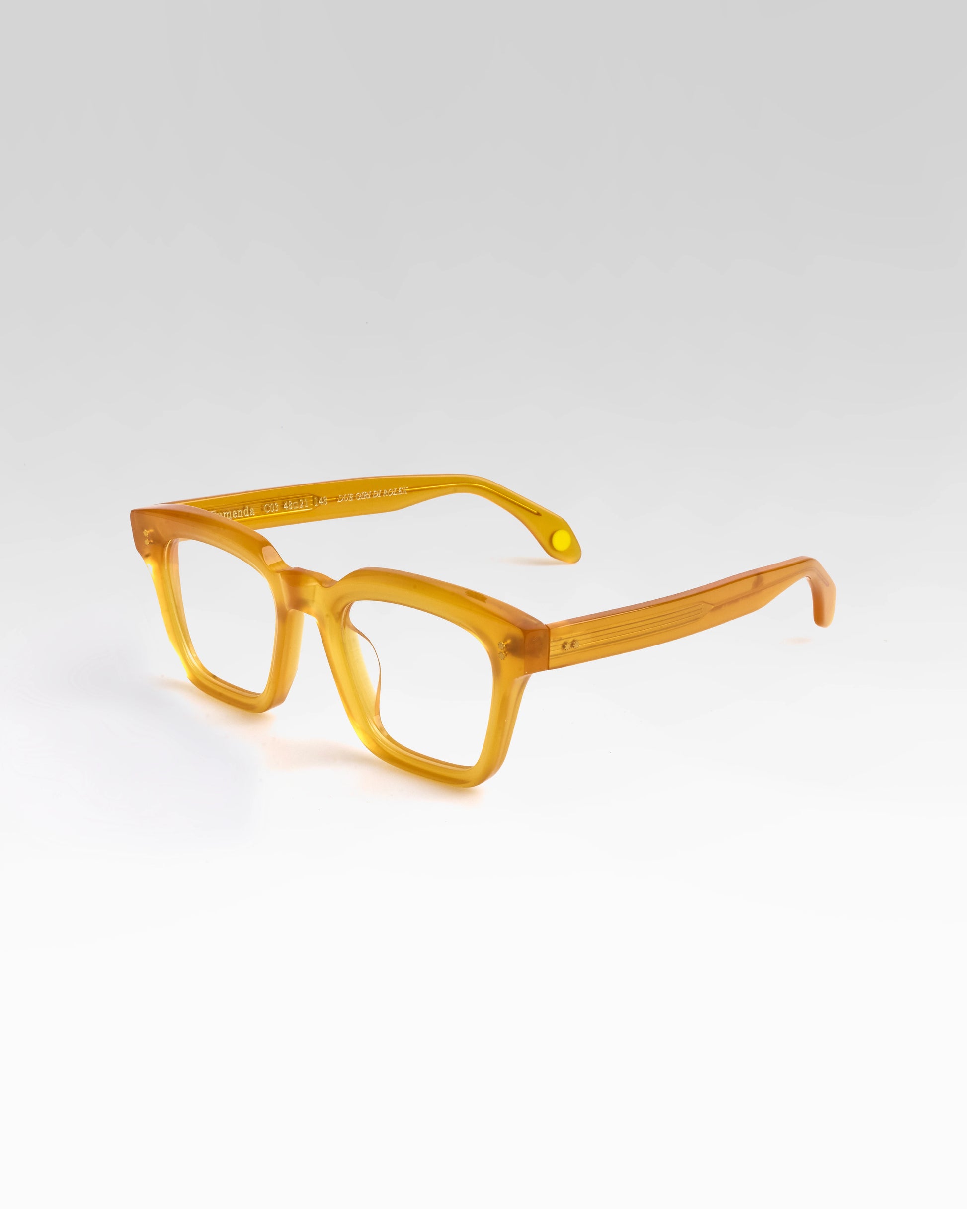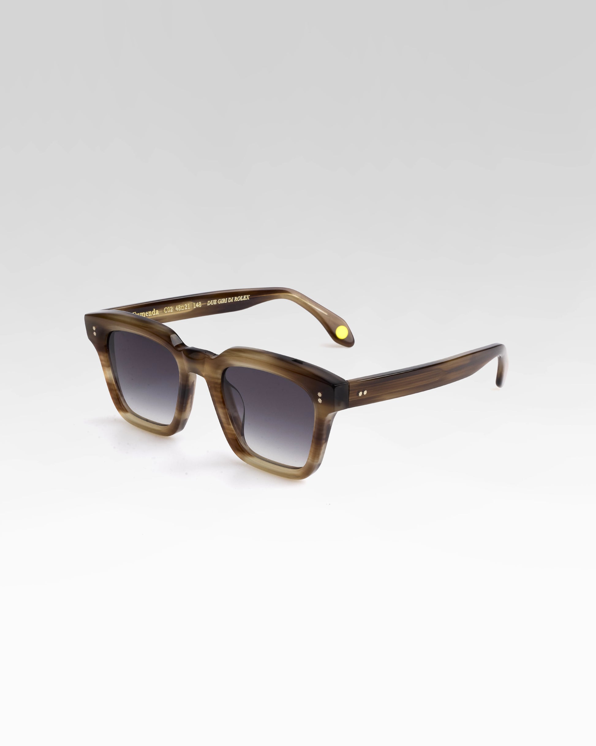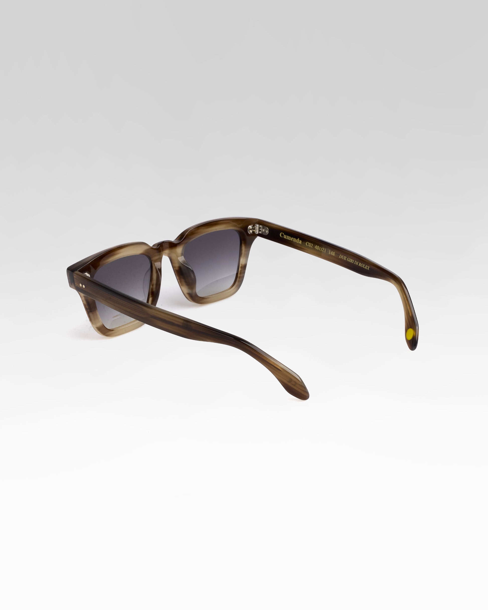 Realizzato interamente in Italia e lavorato per oltre 80 ore da artigiani del Cadore, è costruito in acetato di cellulosa pregiato, con forma squadrata decisa e montatura spessa. Le anime a vista dorate, di ispirazione retrò, impreziosiscono le aste e ne rafforzano l’identità.