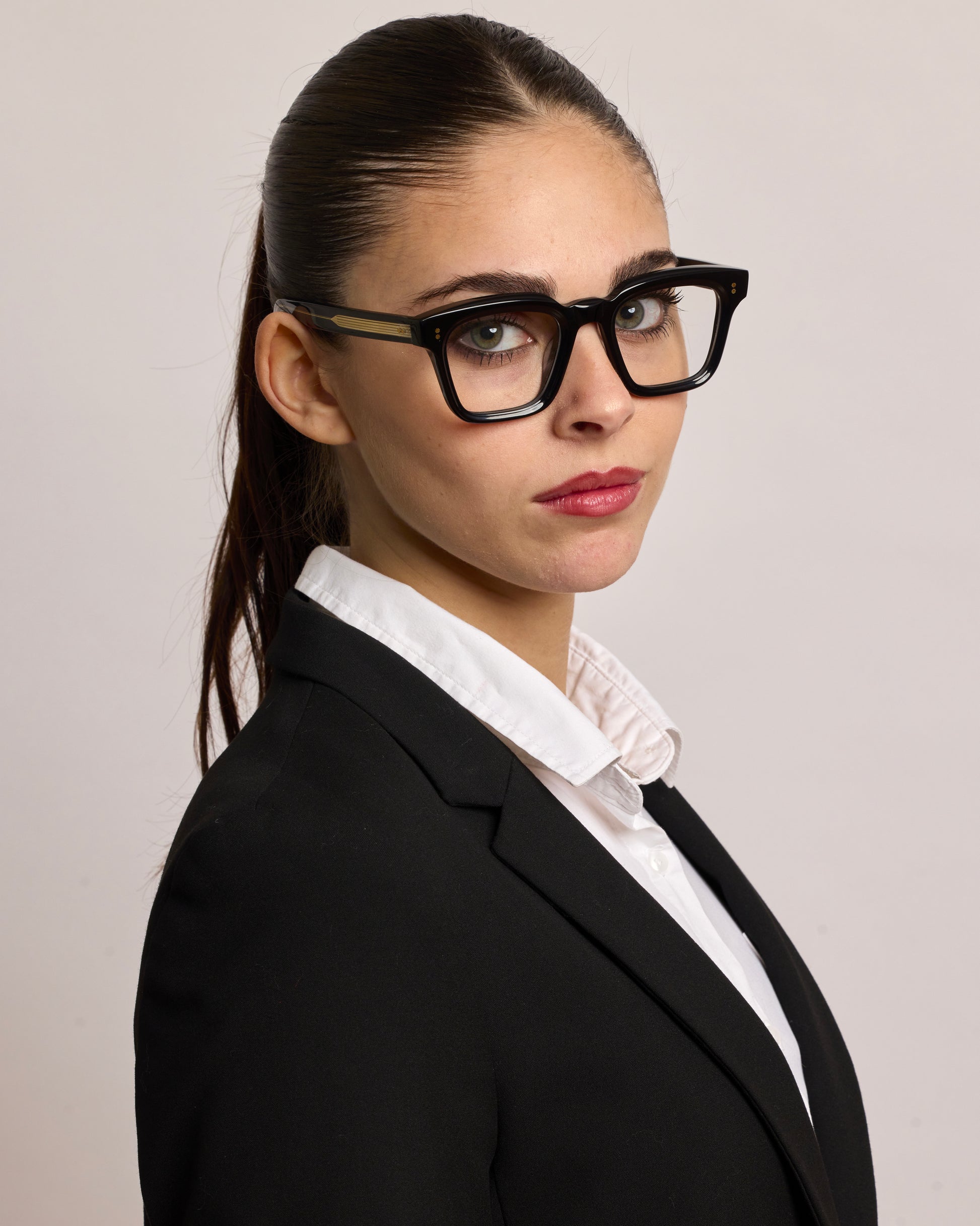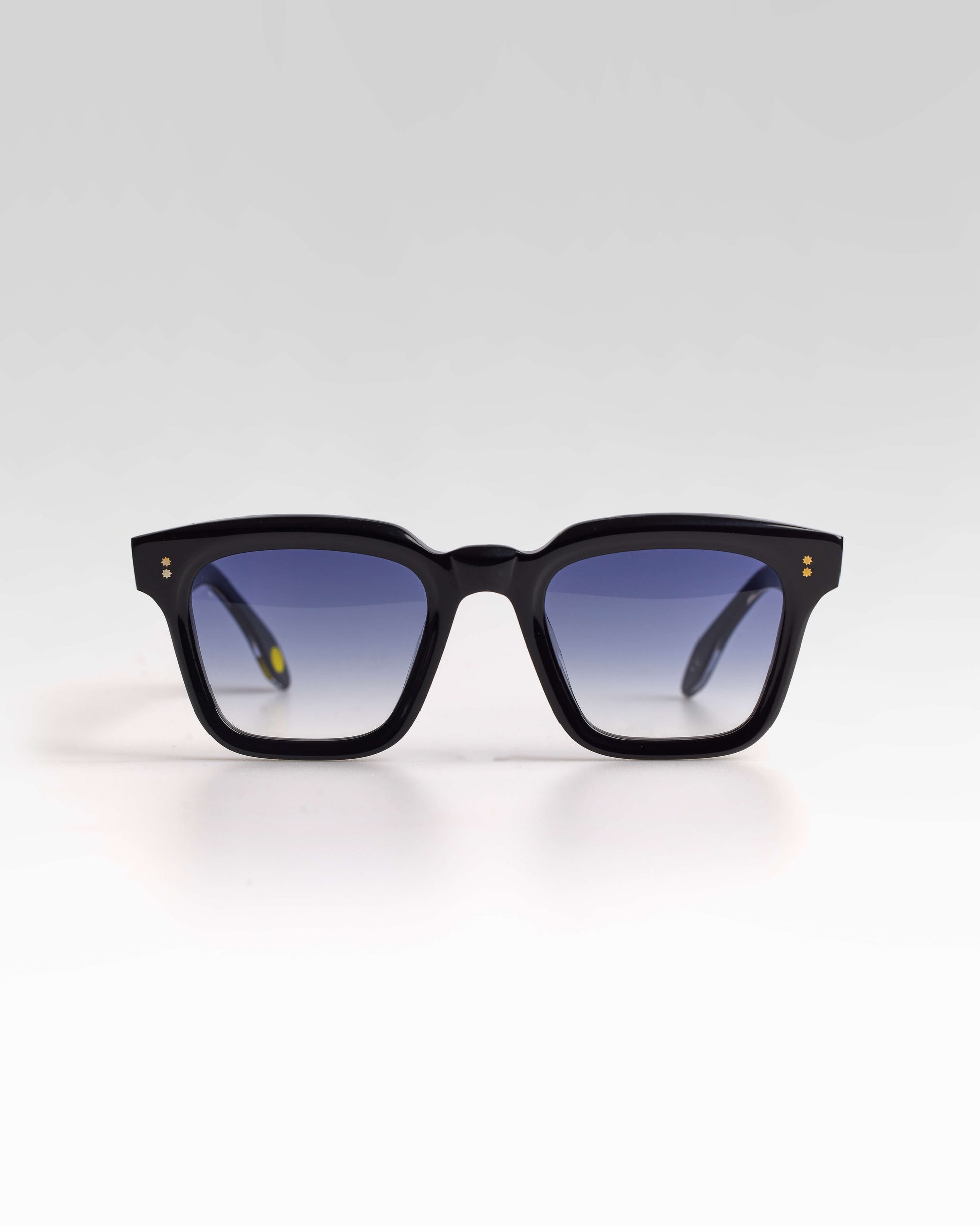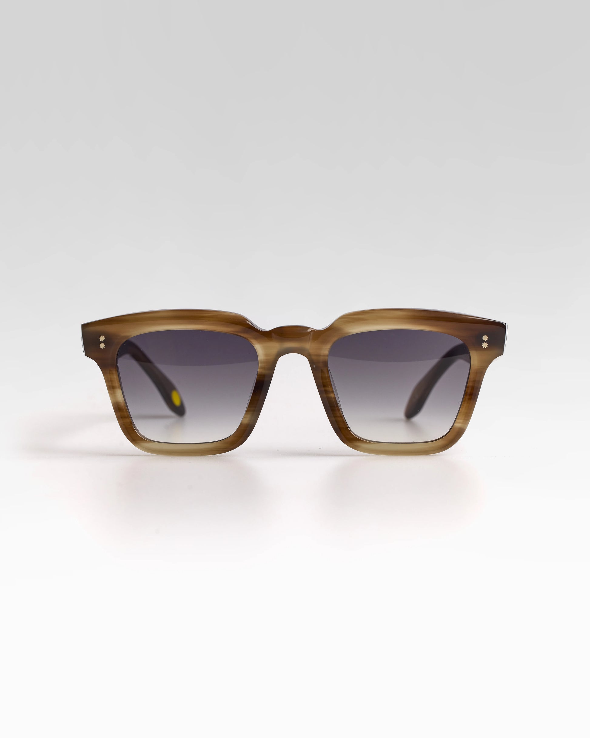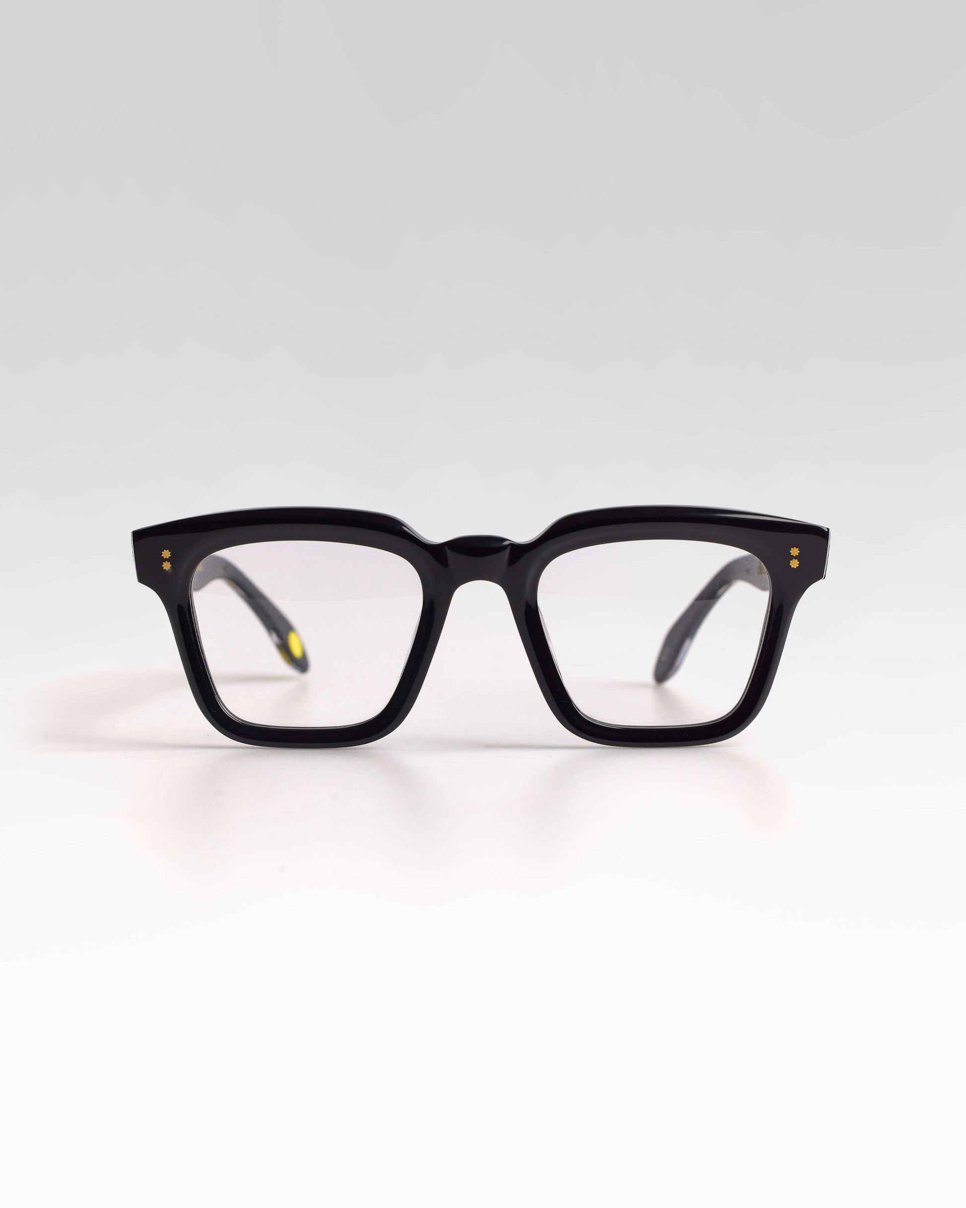 Realizzato interamente in Italia e lavorato per oltre 80 ore da artigiani del Cadore, è costruito in acetato di cellulosa pregiato, con forma squadrata decisa e montatura spessa. Le anime a vista dorate, di ispirazione retrò, impreziosiscono le aste e ne rafforzano l’identità.