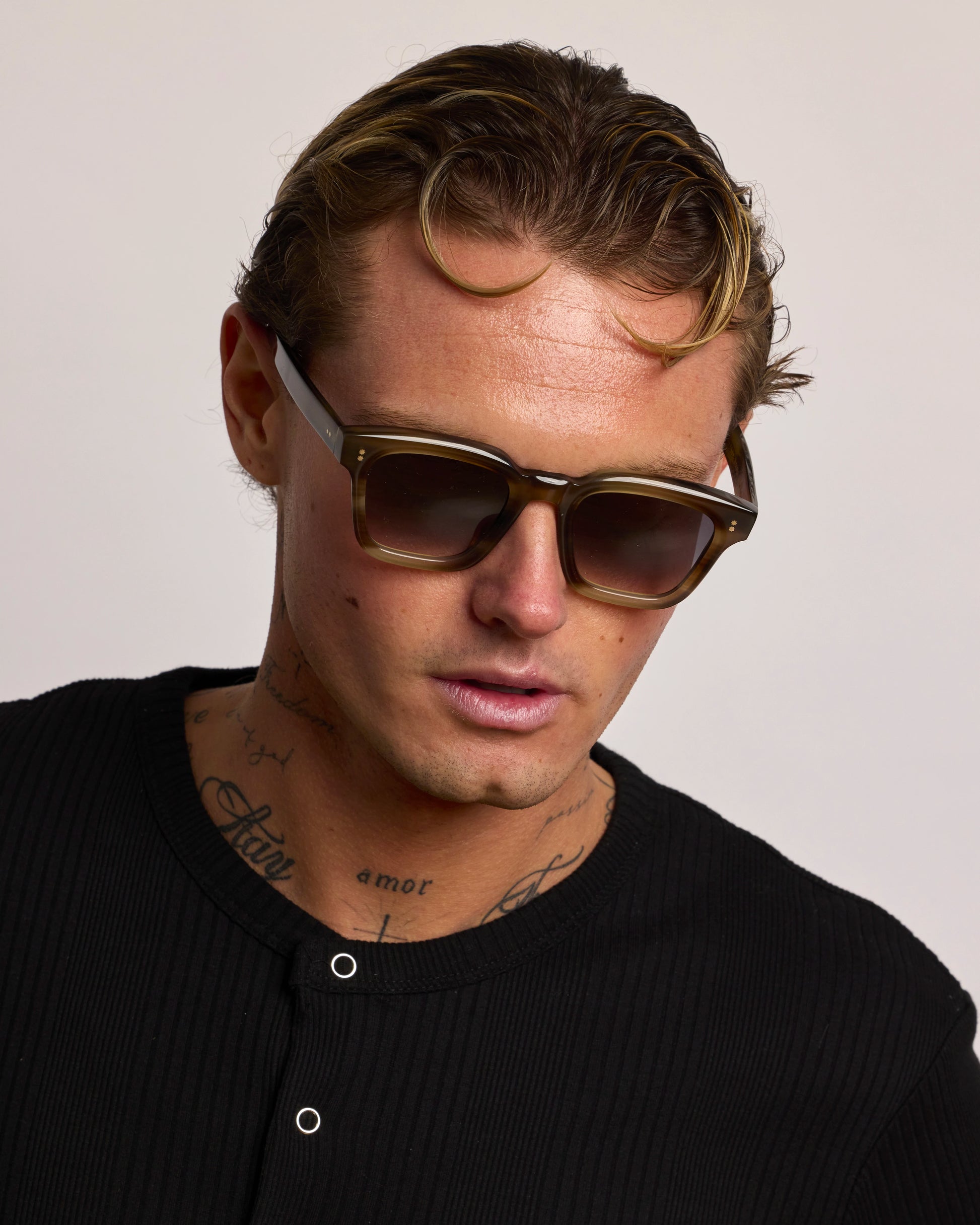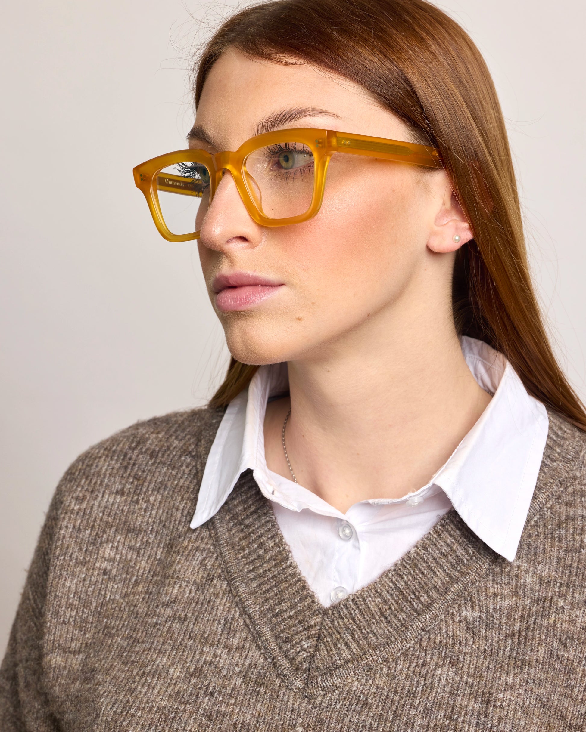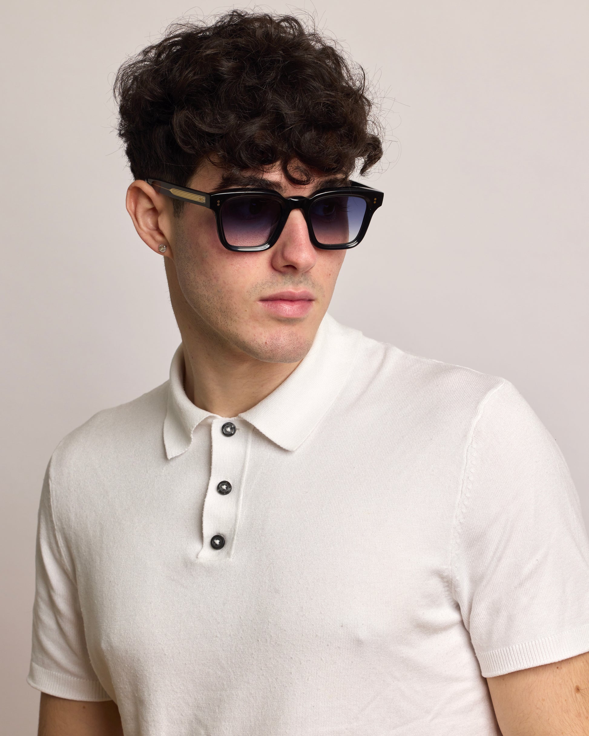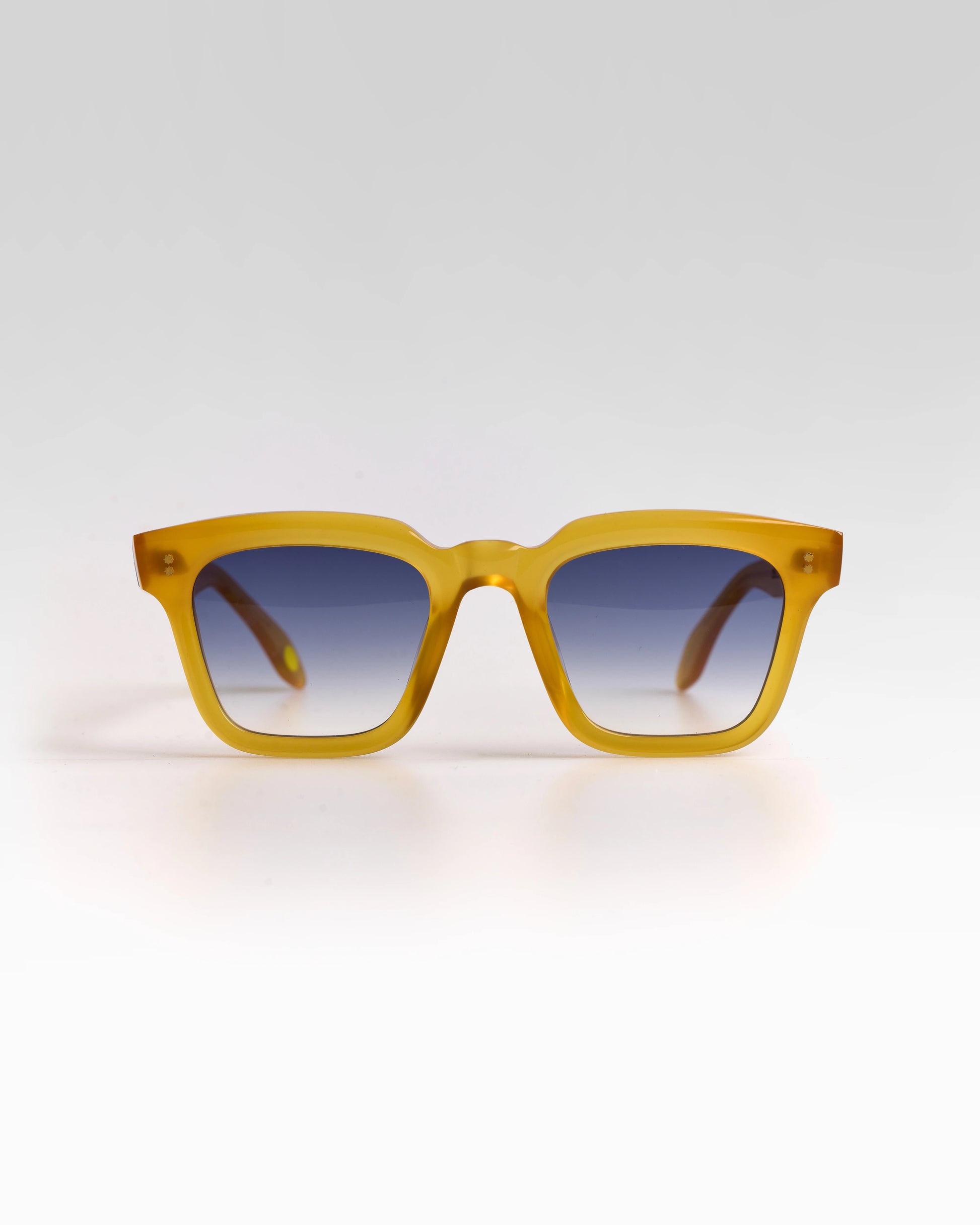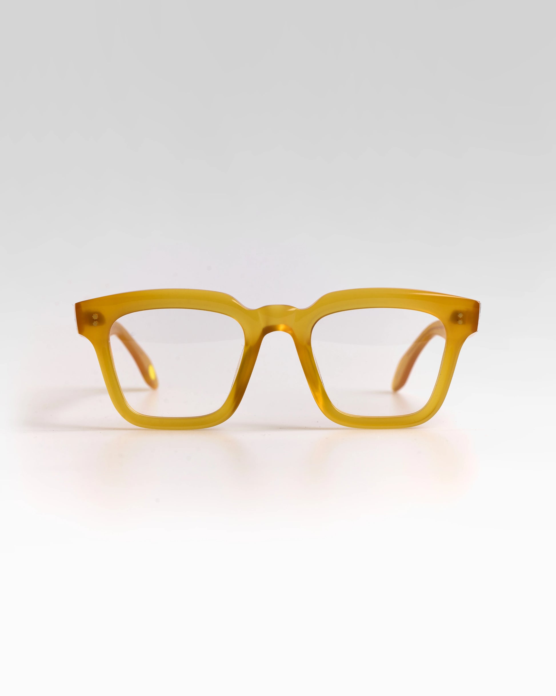 Realizzato interamente in Italia e lavorato per oltre 80 ore da artigiani del Cadore, è costruito in acetato di cellulosa pregiato, con forma squadrata decisa e montatura spessa. Le anime a vista dorate, di ispirazione retrò, impreziosiscono le aste e ne rafforzano l’identità.