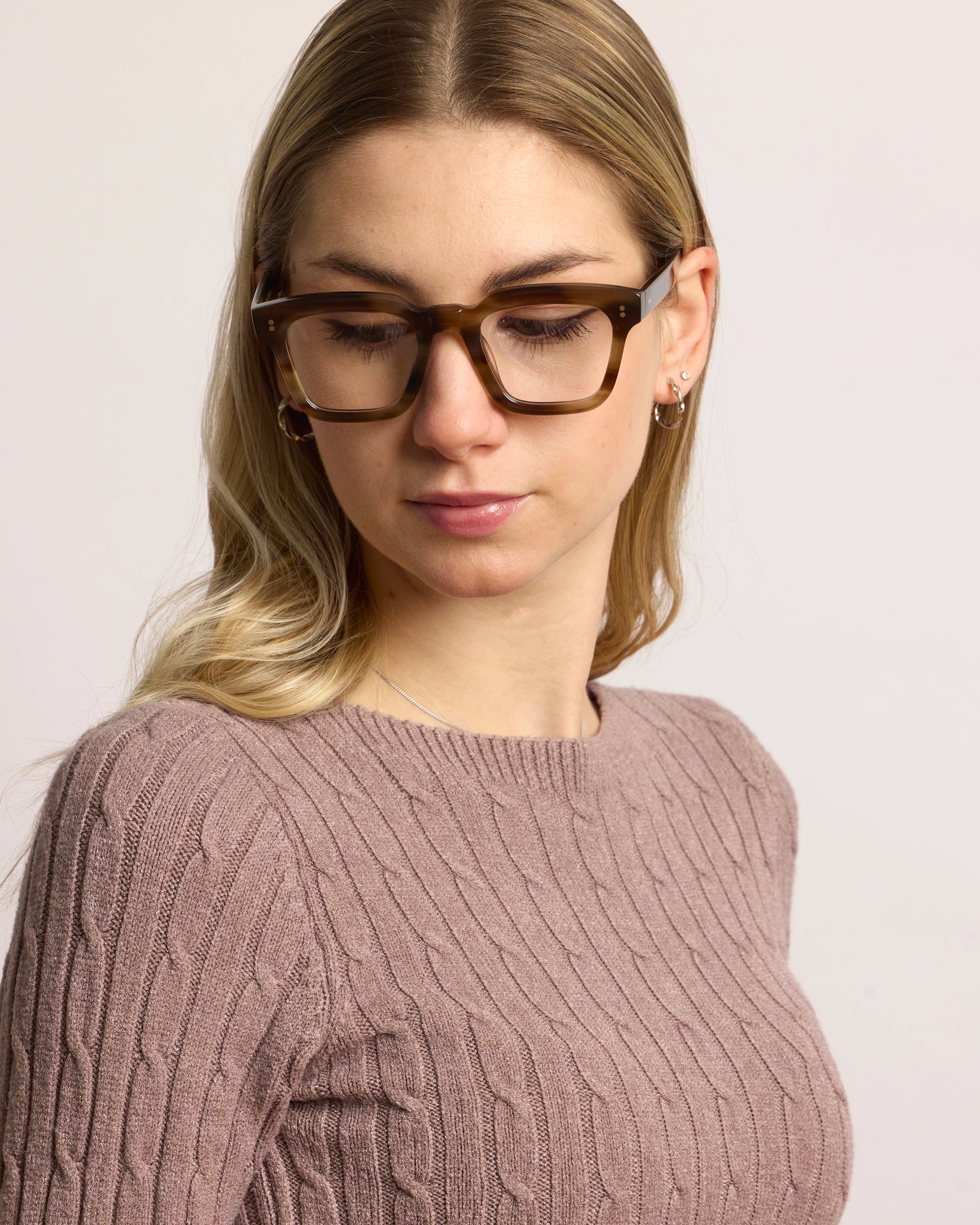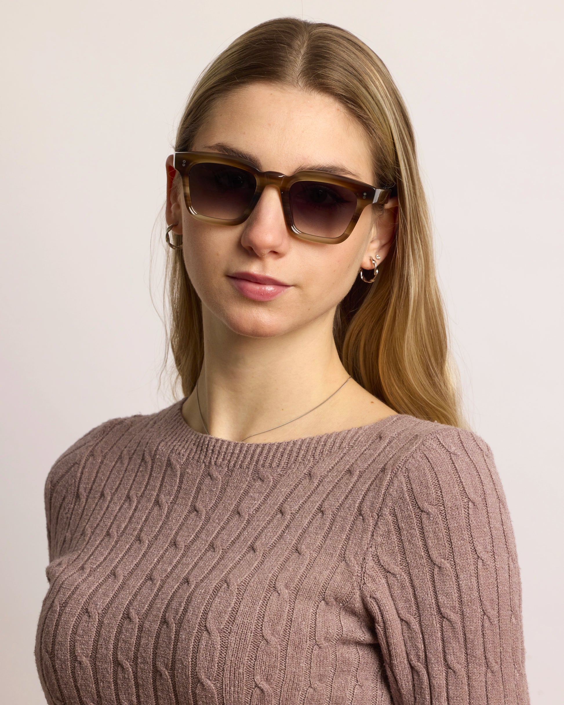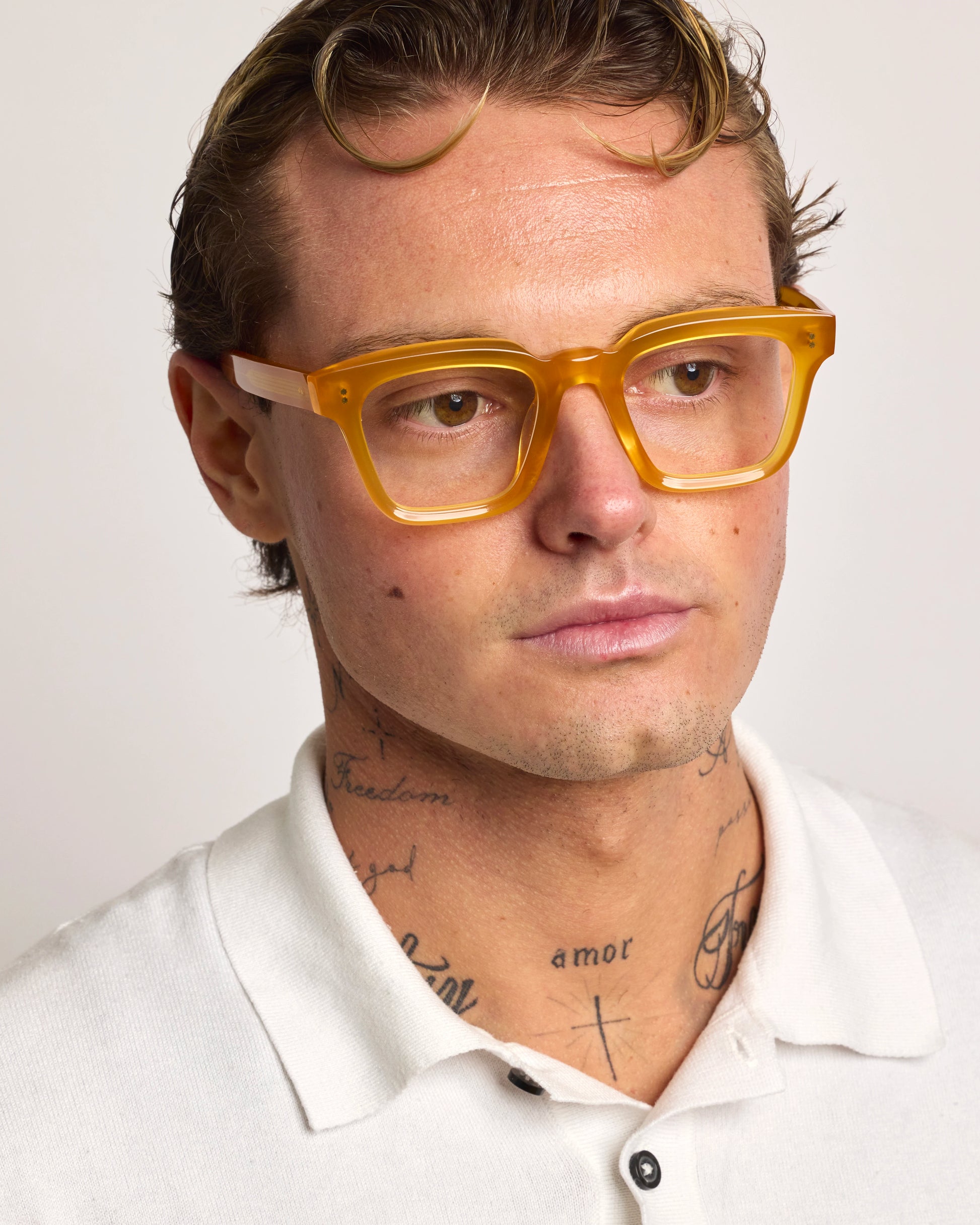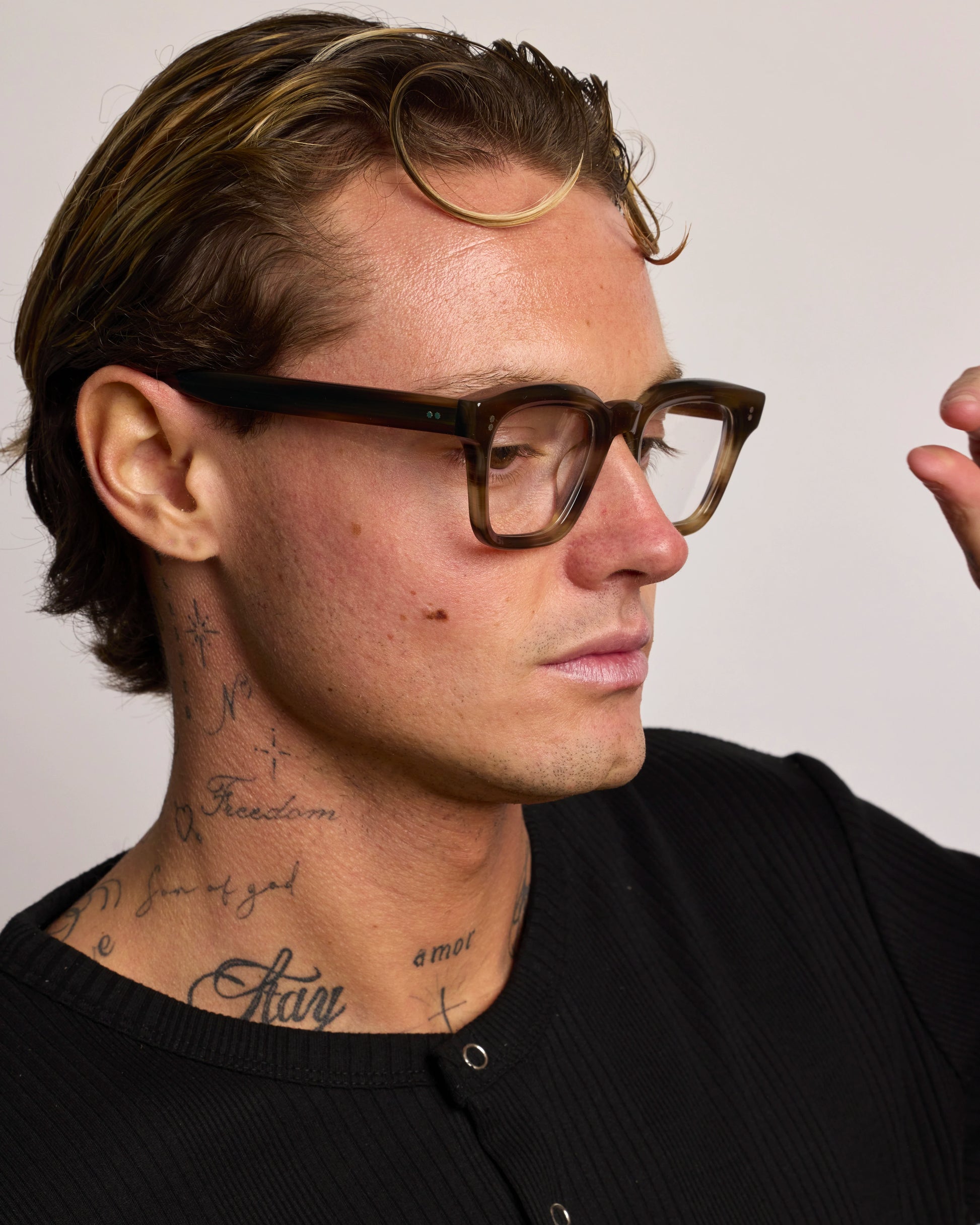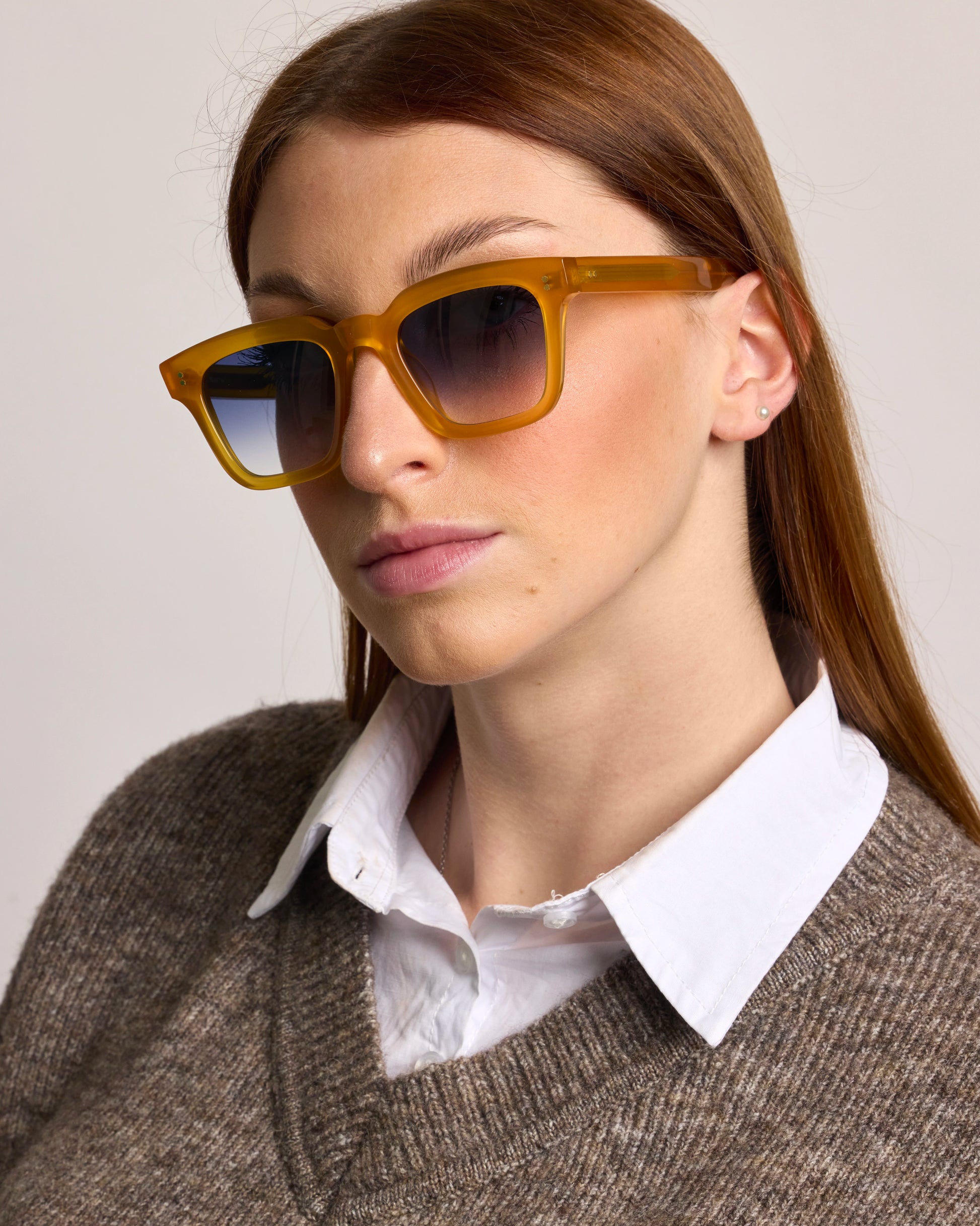 Realizzato interamente in Italia e lavorato per oltre 80 ore da artigiani del Cadore, è costruito in acetato di cellulosa pregiato, con forma squadrata decisa e montatura spessa. Le anime a vista dorate, di ispirazione retrò, impreziosiscono le aste e ne rafforzano l’identità.